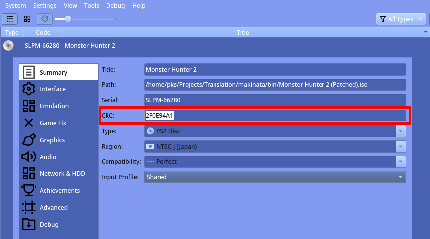 - Open PCSX2 and copy the CRC code for Monster Hunter 2.